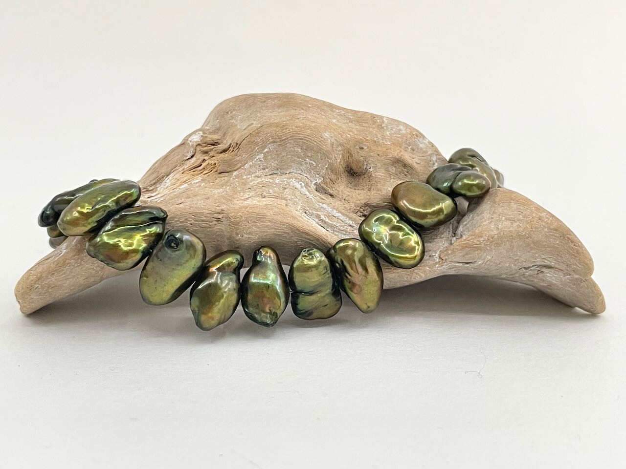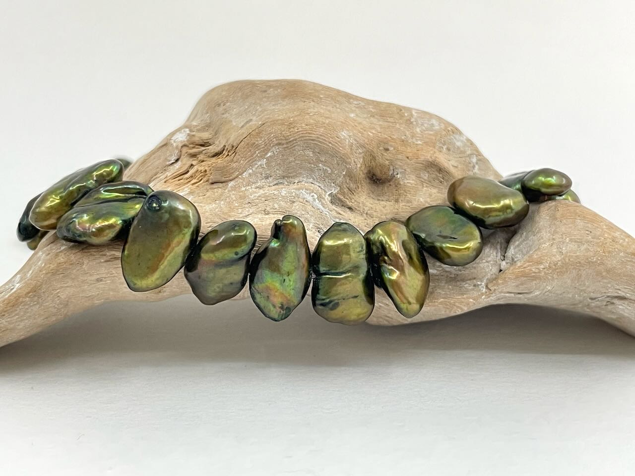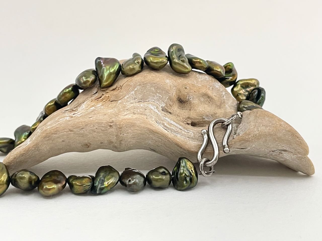 Keshiperlen, an sich schon besonders durch ihre barocken Formen und ihren schönen Lüster, hier in einem seltenen Olivton.