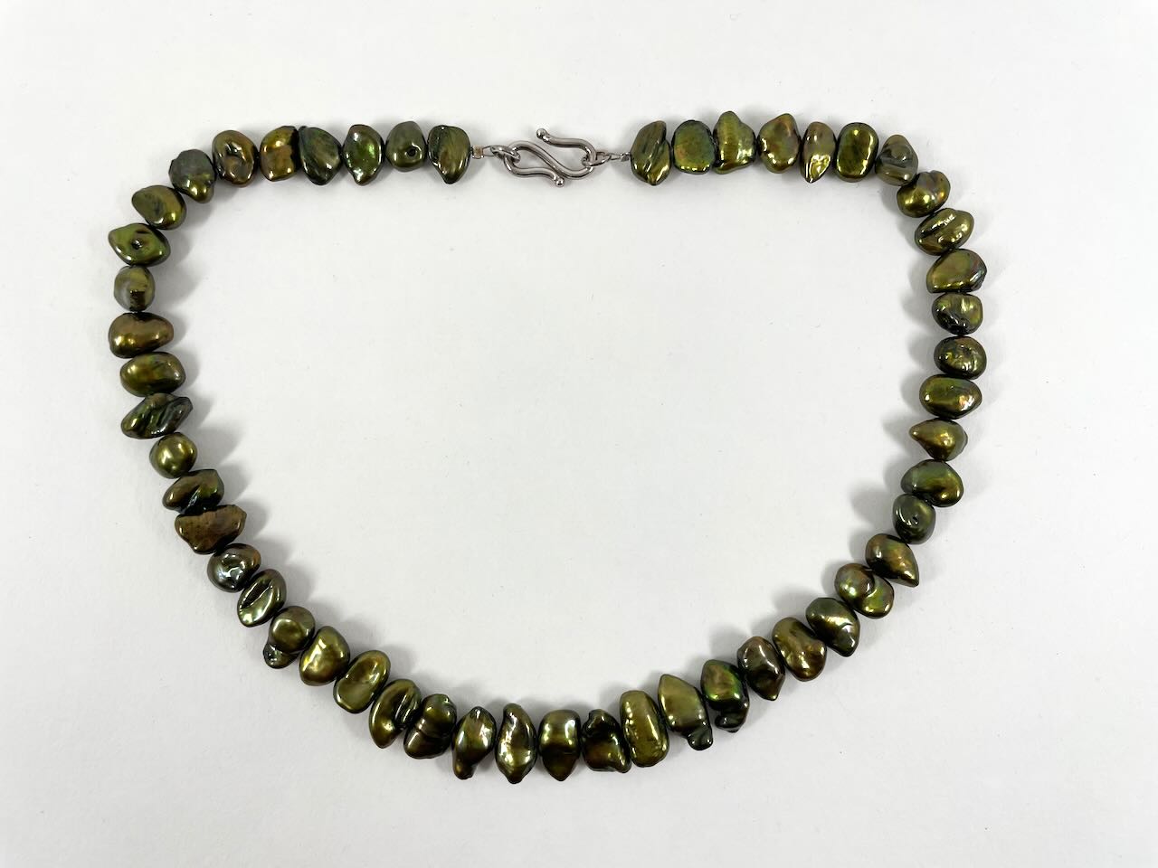 Olivgrüne Keshi-Perlen (gefärbt) von ca. 8 x 15 cm vorne und 6 x 10 mm großen Perlen hinten im Bereich der Schließe