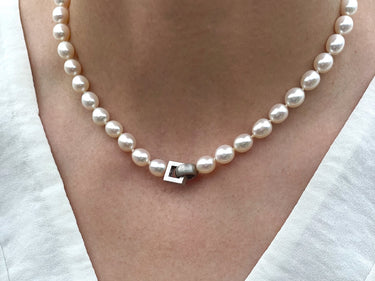 Ovale, weiße Süßwasserperlen, eine wie die andere, alle mit hervorragendem Lüster! Die Schließe ist ein Schmuckstück an sich. Die Klappschließe besteht aus einem runden und einem kantigen Teil. Je nach Anlass kannst du entscheiden, wo du die Schließe tragen möchtest. Als Eyecatcher vorne getragen zeigst du Extravaganz! Dieses handgefertigte Schmuckstück vereint zeitlose Eleganz mit modernem Design.