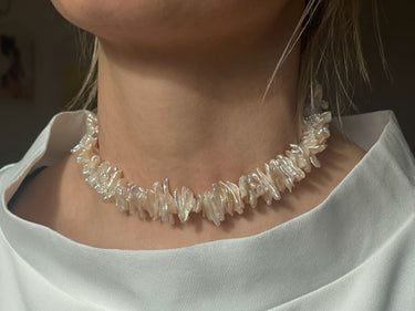 Weiße Biwaperlen in ihrer typischen Stäbchenform, jede anders in ihrer Form! Eine sehr ausgefallene Perlenkette, die eng am Hals als Choker getragen besonders zur Geltung kommt.