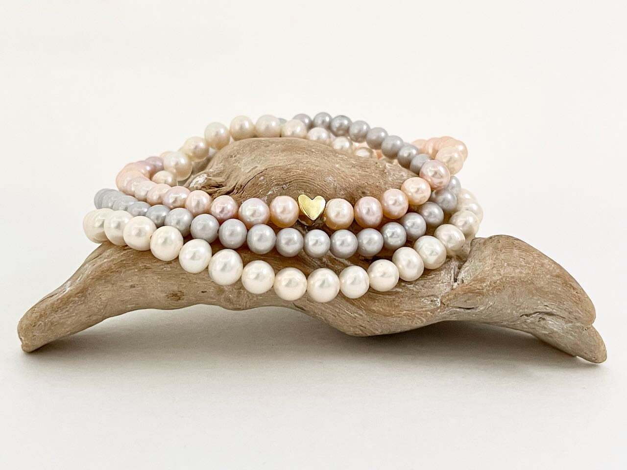 Leicht oval Süßwasserperlen von 6 mm Größe in weiß, rose und grau. Ein Herz wahlweise in Silber, Silber vergoldet oder Silber rosé vergoldet.