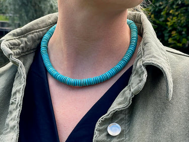 Türkisgrüne Steinscheiben, fein aneinandergereiht, legen sich wie ein Band um den Hals! Ein Schmuckstück, dass dein Outfit durch die Farbe Türkis bereichert und die Blicke anziehen wird.
