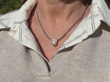 Eine große echte barocke Perle, einzigartig in ihrer Form, ist umringt von kleinen grauen Steinperlen. 2 kleine Goldperlen geben dem Schmuckstück zusätzlich eine elegante Note. Eine zierliche Halskette mit besonderem Charme!