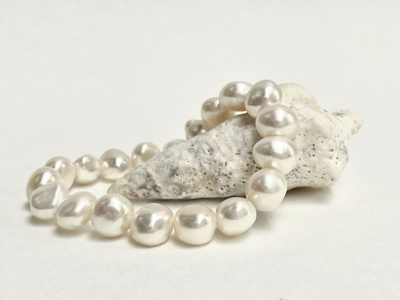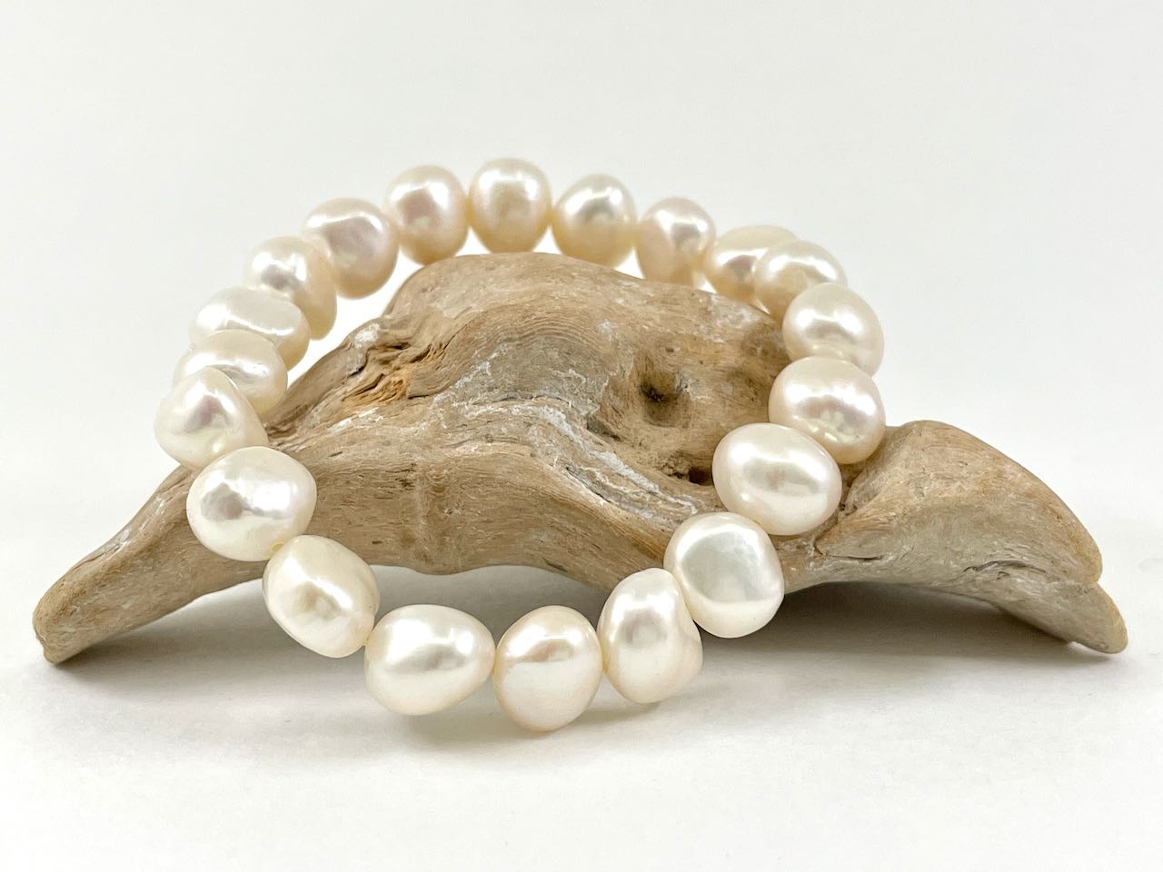Auffälliges Perlarmband aus großen, weißen Barockperlen. Diese Perlen verleihen dem Schmuckstück eine einizigartige Note. Du setzt ein Statement für Eleganz!