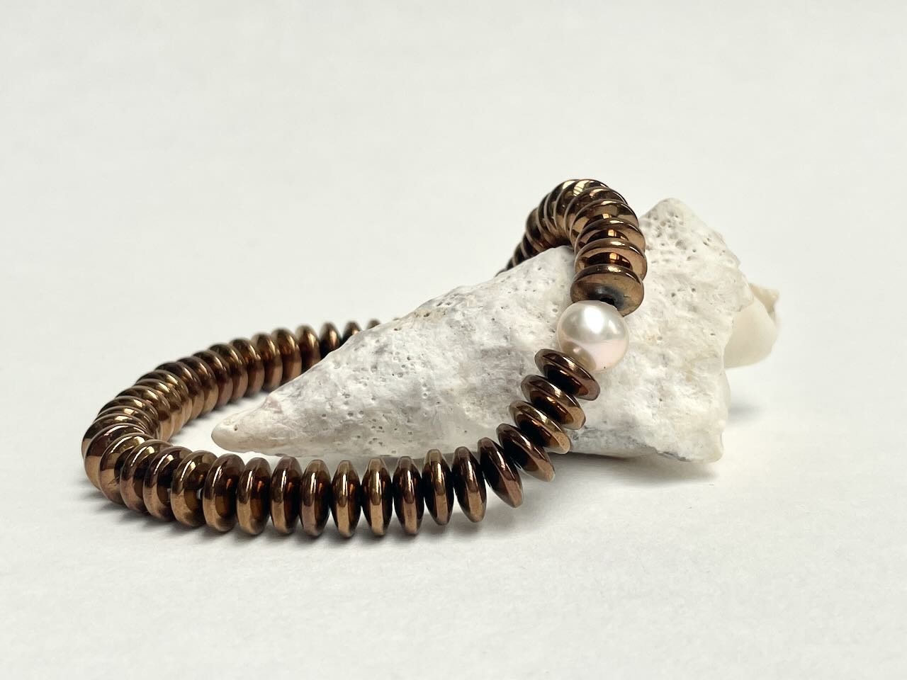 Kupferfarbene Scheiben vom Hämatit von 8 mm Größe und einer echten Süßwasseperle in zartem Rosé