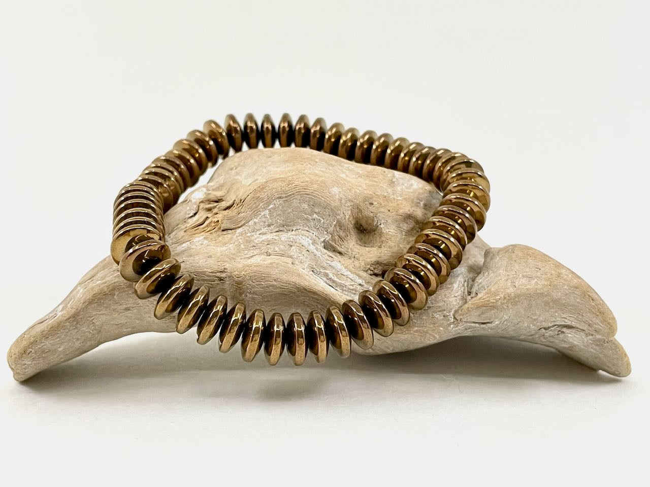 Kupferfarbene, glänzende Steinscheiben, veredelt mit einer wunderschönen, runden Süßwasserperle. Die cremefarbene Zuchtperle fügt sich farblich harmonisch ein.