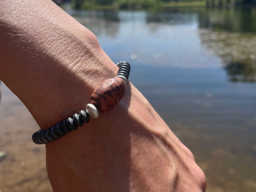 Dunkelgraue Steinscheiben und ein außergewöhnlich gemusterter Stein, dazu 2 Silberperlen, die das Armband veredeln. Dezent, aber außergewöhnlich!