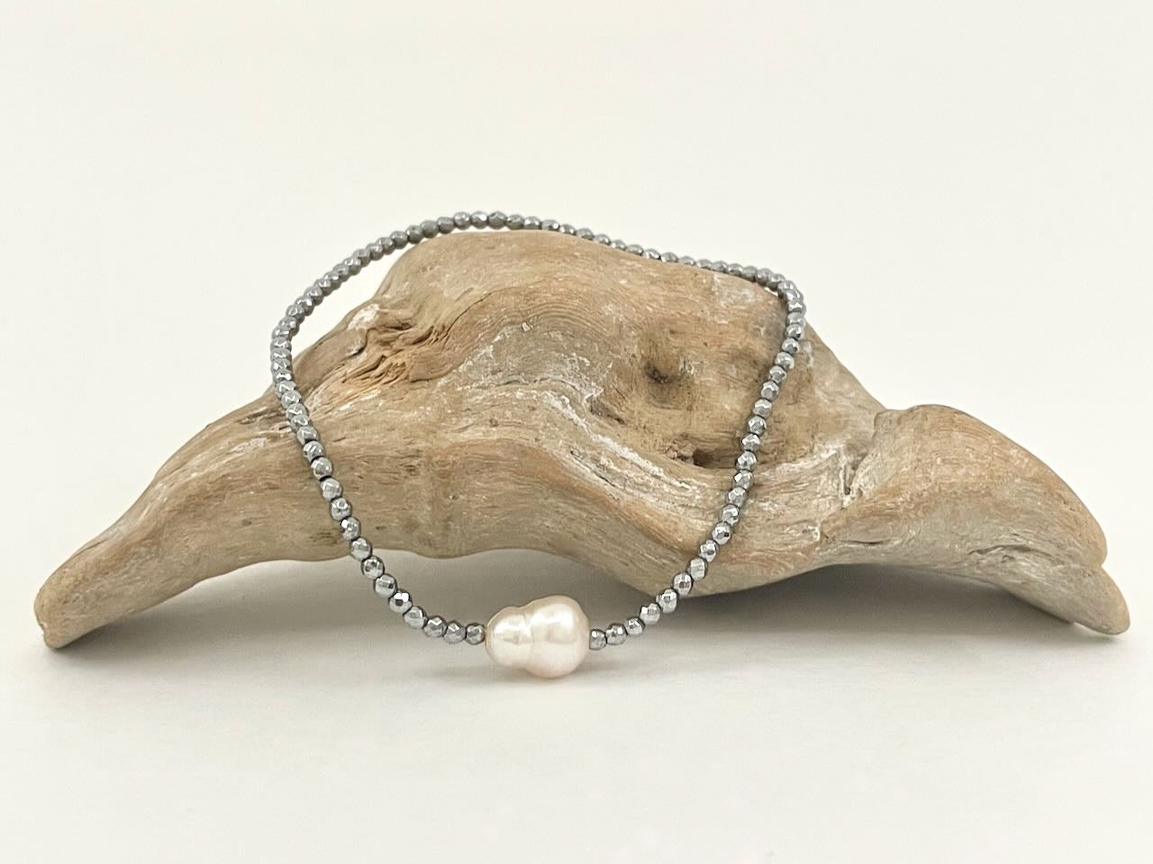 Facettierte silberne Perlen vom Hämatit von 2 mm Größe und einer echten Perlen von 12 mm Länge