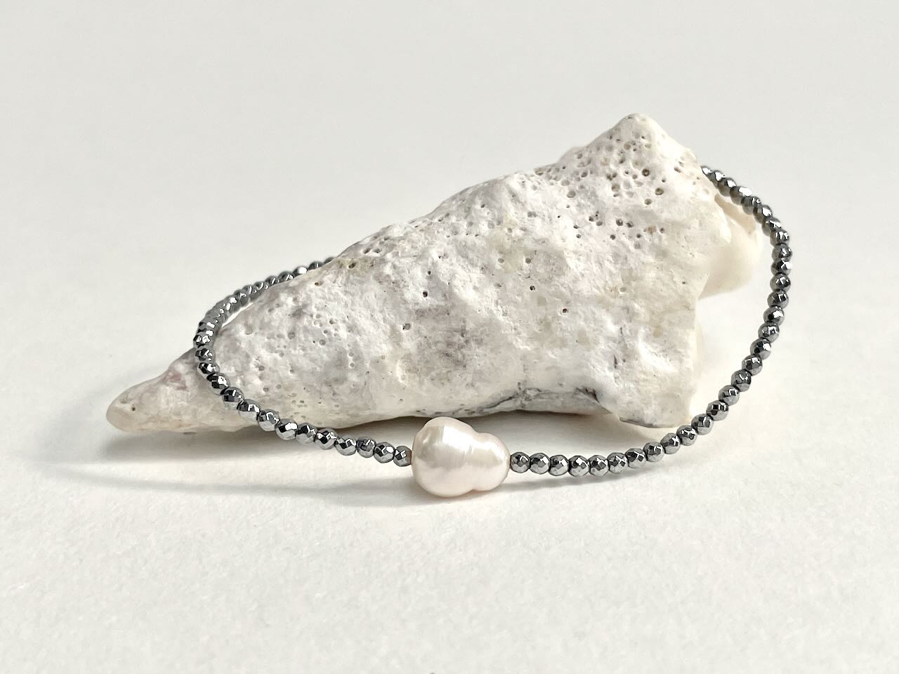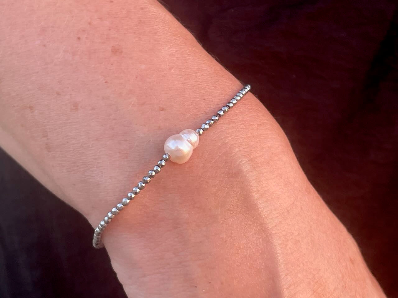 Ein kleines, feines Armband aus glitzernden, silberfarbenen Steinen mit einzigartig geformter Süßwasserperle. Ein filigranes Accessoire mit Charme!