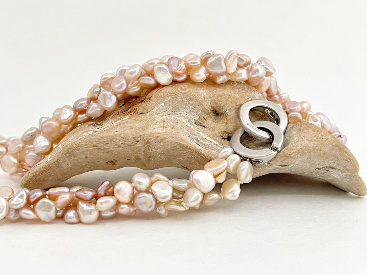 Kleine, zart rosafarbene Keshiperlen zu 3 Strängen verarbeitet bieten zwei Möglichkeiten des Tragens: locker fallend oder zu einer Perlenkordel verdreht.