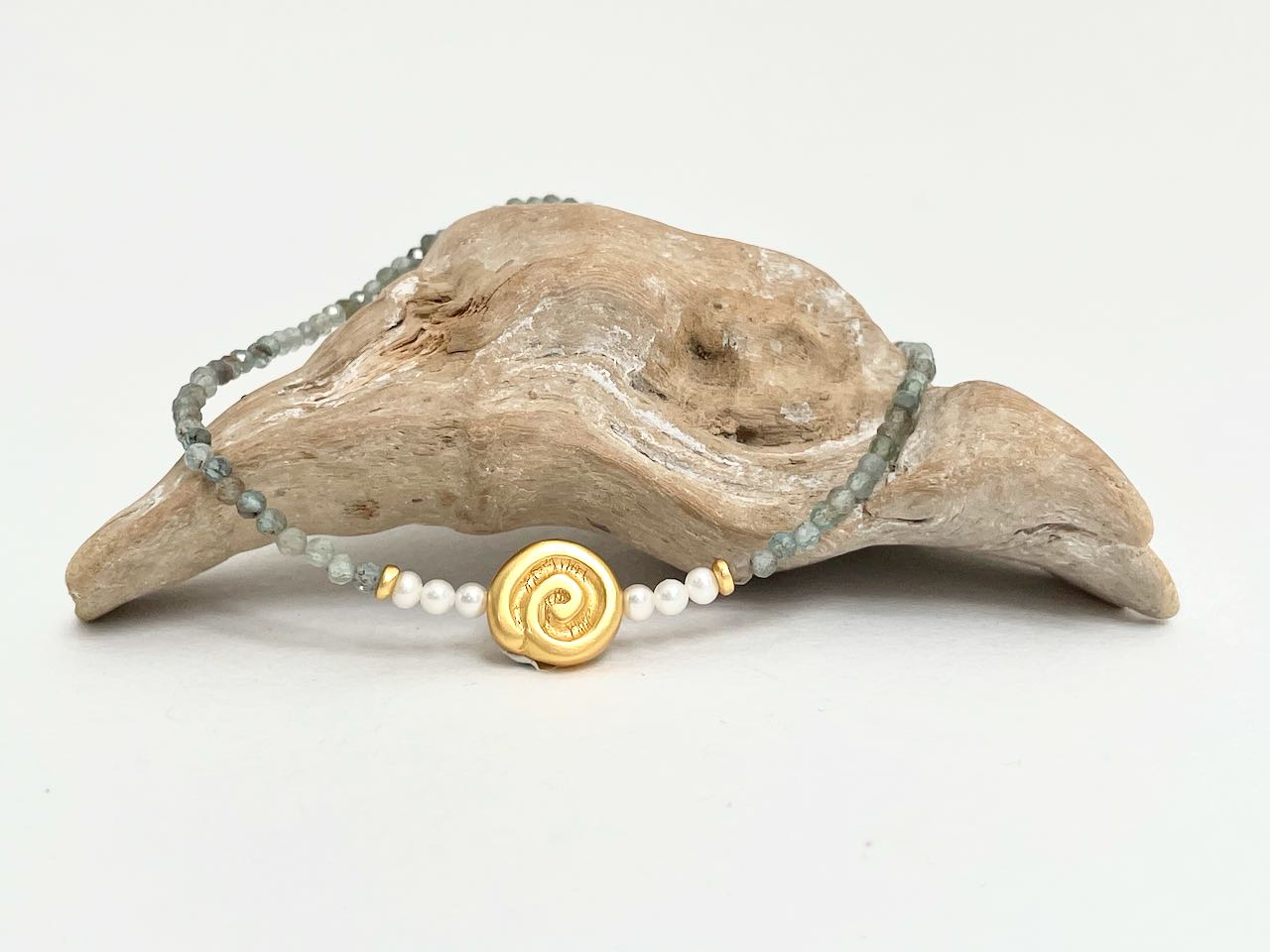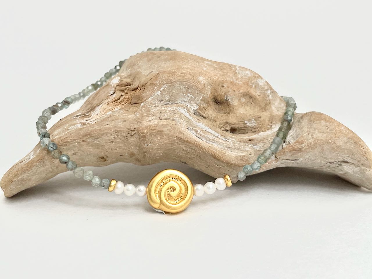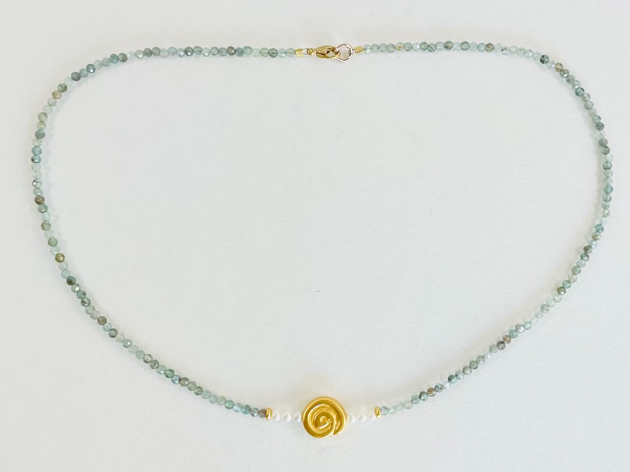 Facettierter Apatit von 2,5 mm Größe, Süßwasserperlen von 3 mm Größe und einem Goldteil Fach alten Inkamotiven 24 ct vergoldet ca. 11 mm groß