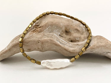 Goldfarbene Quader vom Hämatit von 2 x 3 mm Größe und einer echten, barocken Süßwasserperle von ca. 20 mm